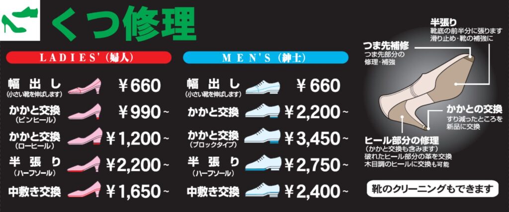 靴修理メニュー・料金例